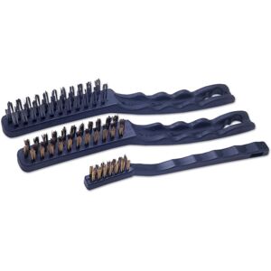 A 3 piece wire brush set complete with 2 brass brushes (large and small) and 1 large steel brush, ideal for use in the workshop and at home. Suitable for a wide range of uses including paint and corrosion removal, cleaning electrical contacts together with cleaning glow and spark plugs. 2 x brass brushes, brush lengths: 33 and 90mm. 1 x steel brush; brush length: 90mm. Plastic, ergonomic grip handle. Hanging holes in handle for storage.