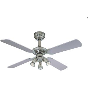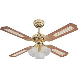 Dimensions and technical details 220-240 V ~ 50 Hz Diameter: 105cm / 42" Housing colour: brushed gun metal Blade colour: black / applewood (reversible) Blade pitch: 11° Lighting: use 3 x GU10 base, max. 3 x 50 W (bulbs not included in the delivery) Motor wattage: 26 / 37 / 43 W Revolutions per minute: 115 / 170 / 220 Max. airflow: 122 m3/min / 4308 CFM Max. noise level: 47 dB(A) Ceiling to blades: 27cm / 10.6" (20cm / 7.8" without drop rod) Overall drop: 40cm / 15.7" (33cm / 13" without drop rod) Diameter canopy: 13cm / 5.1" Max. ceiling slope: 18° Manual reversing switch for summer and winter mode on the housing Independent pull cords for light and fan: light on / off, 3 fan speeds / off Weight: 4.7kg / 10.4lbs