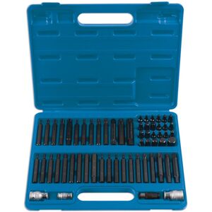 A comprehensive bit and accessory set, including Hex, Spline, Ribe and Star* bits in two different lengths. 30mm long x 10mm Hex drive bits: Hex 4, 5, 6, 7, 8, 10 and 12; Star* T20, T25, T27, T30, T40, T45, T50, T55 and T60 and Spline M5, M6, M8, M10 and M12. 75mm long x 10mm Hex drive bits: Hex 4, 5, 6, 7, 8 ,9, 9.5, 10 and 12mm; Star* T20, T25, T27, T30, T40, T45, T50, T55 and T60; Spline M5, M6, M8, M9, M10 and M12; Ribe RM6, RM7, RM8, RM10 and RM12 andSquare 8 and 10mm. 30mm long x 14mm Hex drive: Hex 14 and 17mm. 75mm long x 14mm Hex drive; Spline M14 and Spline Tamperproof M16. Accessories: 14mm Hex bit adaptor x 1/2""D; 10mm x 14mm Hex drive buffer adaptor; 2 x 10mm Hex bit adaptors: 3/8""D and 1/2""D. Bits manufactured from impact grade S2 steel with phosphate coating, adaptors from chrome vanadium.