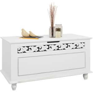 Beautiful chest with generous storage space! The large wooden chest in an elegant shabby design makes a great addition to any room! The lid of the wooden chest is folding and lockable . The large box can be filled with items worth up to max. 100 kg . Versatile: Use as wooden chest, seat bench, sofa table, laundry basket, cushion box, newspaper or toy box! Product details: Modern shabby chic design Robust construction Stable lid Practical locking lever inside Quick and simple assembly Versatile wooden storage chest Decorative carved wood Stable feet Technical specifications: Dimensions (LxWxH): 80 x 40 x 48cm Max. 100 kg Load capacity Material: MDF Colour: White Scope of Delivery & What's Included: 1 Wooden Storage Chest Assembly Fixings Assembly Instructions
