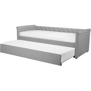 Upholstered Pull-Out Bed. With a blend of functionality and style, this trundle bed, upholstered in durable polyester linen, is a practical addition to any interior. Thanks to its classic design the piece seamlessly blends in with minimalist, contemporary and traditional decor styles. The bed features a slatted base, that allows for even body weight distribution, which results in healthy and undisturbed sleep. It can provide an additional sleeping surface with a single pull, which comes in especially handy when hosting a sleepover. Details: Product Type: Daybed Style: Retro General Color: Grey Shade: Light Grey Material Type: Fabric Main Material: Fabric Additional Material: Rubberwood Material Composition: 100% Polyester Fabric Upholstered Back: No Storage: No Dimensions: Headrest Dimensions: 96x77 Width: 96/188 cm Length: 214 cm Height: 82 cm Sleeping Surface: 90x200 cm Weight: 46 kg Weight Capacity: 130 kg Offer Includes: 1 x Bed Frame, 2 x Slatted Frame (Number of Slats: 15), Not