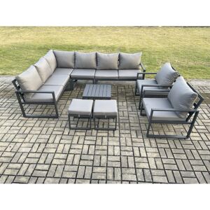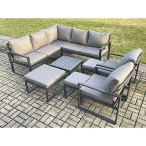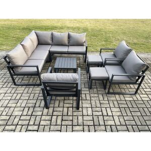 This 9 Pieces aluminium Outdoor garden furniture set can be used both indoors and outdoors, with high quality aluminium Frame construction for sturdiness and long lasting. it can also be placed on the patio or balcony, The design of this patio lounge sofa set is a perfect blend of country chic and modern minimalism, adding an elegant touch to your house. Set Dimensions: 1 x Left Sofa with single armrest: 125W x 70D x 78H cm 1 x Right Sofa with single armrest: 125W x 70D x 78H cm 1 x Corner Sofa70L x 70W x 78H cm 1 x Armless Sofa Size: 60L x 70W x 78H CM 3 x Chair Size: 74L x 70W x 78H cm 1 x Big footstool 60L x 60W x 35H cm 1 x Square Coffee table : 60L x 60W x 35H cm Dark grey powder coated with dark grey fabric .Color may vary little due to light or monitor .we are unable to return the item due to color problem .please contact us before purchase if you have requirement on color saturation. the product is delivered on pallet, to kerbside only. Fimous 10 Seater Aluminium Garden Furniture Set Outdoor Lounge Corner Sofa 3 Pcs Chair Square Coffee Table Sets with Big Footstool Dark Grey
