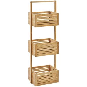 3-Tier Bathroom Shelving Unit. This bathroom shelving unit features three quaint baskets, intricately crafted from natural bamboo. Each basket serves as a shelf, offering a unique and stylish storage solution that is both functional and decorative. The bamboo construction not only adds a touch of warmth and rustic elegance to your bathroom but also ensures durability. Perfect for organizing toiletries, towels, or decorative items, this compact shelf unit is ideal for small spaces. Details: Product Type: Bathroom Shelf Style: Boho General Color: Brown Material Type: Wood Main Material: Bamboo Wood Shelves number: 3 Drawers: No Finish: Melamine Key Locked: No Shelves: Yes Dimensions: Depth: 20 cm Width: 27 cm Height: 80 cm Weight: 2 kg Drawer Weight Capacity: 3 kg Top Weight Capacity: 3 kg Offer Includes: 1 x Shelving Unit Key Features: Modern Design, Sturdy Frame Construction, High-Quality Materials, High Durability, Additional Storage Space Assembly Information: Full Assembly