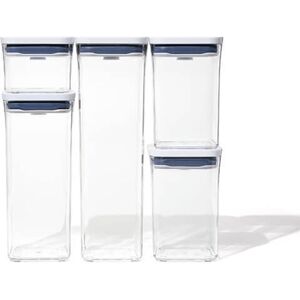 Set comprises: Set includes: 1 x 2.1L container, 1 x 1.6L container, 2 x 1L containers and 1 x 0.4 L container. OXO Good Grips POP Set of 5 Containers - the key to keeping pantry staples fresh and kitchens organized. Each BPA-free container is airtight, stackable, space-efficient and suitable for use in the dishwasher. Perfect for storing everyday favourites, from flour to coffee, sugar to cereal, pasta to spices. Push the button to engage the airtight seal. The button doubles as a handle for the lid.