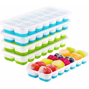 4 packs of ice cube trays with lids This product is made of PP plastic + silicone base Advantages: No strange smell No silicone oil leakage, More suitable for small refrigerators, One piece with 8 compartments, no food waste Quick icing Disadvantage: After taking it out of the fridge, the bottom should be rinsed with water for 30 seconds to make it easier to wring out the ice cubes Multifunctional use Making jelly Drinking Making baby food Product information Size: Ice cube mold: 5.6 x 2.8 x 1.4 inch Ice cubes: 1.1x1.1x0.98icnh Color: Pink + blue + green + yellow Material: high quality silica gel + high quality plastic Silicone on the bottom Silicone on the bottom, quickly squeeze the ice cubes Prevent the ice cubes from sticking Close the cover < p > Isolates odors, does not leak water and is easy to open !!! The lid cannot be put in the dishwasher or the oven, otherwise it will deform Mini ice cube size 8 ice cubes, no waste Mini size Freeze quickly, no waste 4 lids Stackable in the