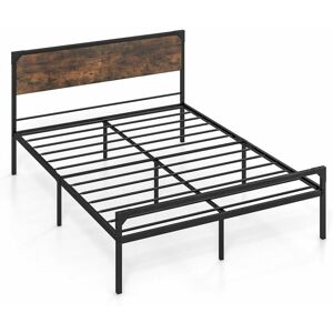 Elevate your bedroom with this heavy-duty platform bed, designed with a sleek wooden headboard and footboard for a sophisticated touch. The bed frame is constructed with powder-coated metal slats, providing reliable support and long-lasting durability. No need for a box springthis platform bed is designed to hold your mattress securely, giving it a firm foundation and extending its life. Additionally, the under-bed space can be utilized for shoes, bedding, storage boxes or sweeping machine, helping to maintain a clean and orderly living space. Enjoy a sleek and functional bedroom retreat with this metal bed frame. Costway King Metal Bed Frame Industrial Platform Bed w/ Wooden Headboard in Brown