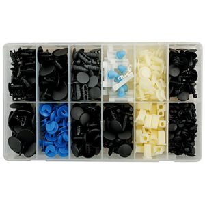 A mixed set of 12 types of trim clips including button, moulding and panel clips, fir tree fixings, locking nuts - original manufacturer replacement trim clips - to suit Fiat vehicles. Assorted Box of Trim Clips for Fiat. 12 popular application clips. 1:1 image labelling for easy identification of parts. Full range of replacement packs available. Box contains 308pc.