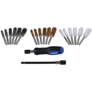 A comprehensive wire brush set suitable for numerous applications including removing carbon from internal threads, pipes, drilled holes or small bore holes. The set includes six stainless steel brushes, six brass brushes, six nylon brushes, a soft grip handle with quick chuck fitting and a 150mm extension which includes a quick chuck fitting. Three types of brushes: stainless steel, brass, nylon; all with 1/4"" quick chuck shanks for power tool use. Each type of brush available in 6 sizes: 9, 11, 13, 15, 17, 19mm Set includes a 150mm (6 inch) extension with quick chuck for power tool use. Soft grip handle for comfortable hand use. Supplied in a canvas fold up case. Replaceable Brush Sets available, please see Laser Part Nos. 1846 (nylon), 1847 (brass), 1848 (stainless steel). All in packs of 6 brushes.