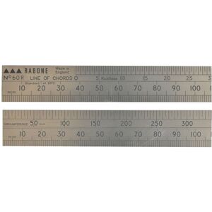 The Line of Chords Scale rule incorporates a scale from 0° to 120° in 1/2º increments. Two centre dots are provided, one on each blade and, with the aid of dividers, the rule can be set at any angle, or an existing angle can be determined. The circumference scale indicates the circumference by measuring the diameter. Packed in display wallet. 600mm (24 in) Length. Sub divided mm and line of chords scale one side. Sub divided mm and circumference scale in mm other side.