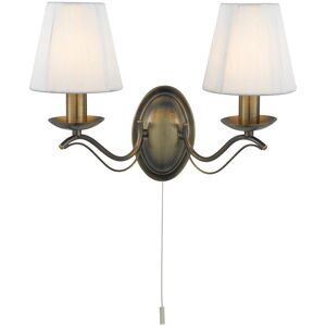 9822-2AB Andretti traditional antique brass 2-light wall bracket supplied with delicate cream faux silk shades. FEATURES * Traditional double wall light * Antique brass finish * Complete with cream faux shades * 2 lights (not included) * Switched SIZE * Height: 260mm * Width: 370mm BULBS * Takes 2 x 40 watt E14 Bulb - (NOT INCLUDED) ORDER CODE * 9822-2AB
