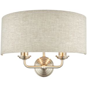 The Laura Ashley Sorrento is a subtle and sophisticated double wall light. The light features a single contemporary shade in sleek grey linen fabric with a pearlised inner. This 2 light wall fitting has a round, Art Deco style, stepped wall plate, and comes in a traditional polished nickel finish, adding grown-up atmosphere to your dining or living area. FEATURES * Wall light * Polished Nickel finish * Grey linen shade * Takes 2 lamps * Class 2 (double insulated) * Dimmable with suitable lamp / dimmer switch SIZE: * Height: 25 cm * Width: 35 cm * Depth: 18 cm BULBS * Requires 2 x 40 watt max Small Edison Screw Candle Lamps (not included) * Ideal for use with LED lamps