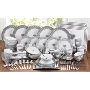 Be the envy of your friends and family with this beautiful Grey Heart 80-piece porcelain dinner set with serving pieces, matching placemats and cutlery set. Everything you need for everyday dining. This set is ideal for any occasion and makes a perfect addition to any kitchen or dining table. Set includes: 6-piece Round Dinner Plates 27.2cm. 6-piece Round Side Plates 20.4cm. 6-piece Round Pasta Bowls 20.3cm. 6-piece Deep Cereal Bowls 14.3cm. 6-piece Round Fruit/Snack Bowls 10.1cm. 6-piece Egg Cups. 6-piece Mugs 10oz. 6-piece Placemats 29 x 21.5cm. 6-piece Coasters 10.5 x 10.5cm. 2-piece XL Mats 40 x 30cm. 24-piece Stainless Steel Cutlery 6 knife, fork, spoon and teaspoon. Waterside