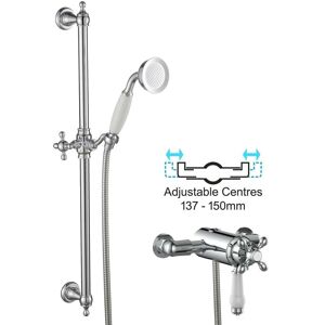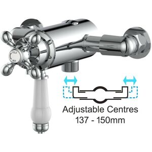 This exposed traditional shower mixer valve is one of the most versatile replacement shower valves on the market. Featuring a ceramic level handle and indices traditional lever appearance of this Dual Exposed Thermostatic Shower Valve makes it the perfect addition to a period bathroom. It features the option of a top or a bottom outlet (comes as bottom as standard) for both 1/2"" rigid riser rails and standard shower hoses. Fully adjustable elbows between 137mm and 150mm all you to replace many old mixer showers with ease. Includes backing plate for ease installation. Elbows can also rotate to allow pipework to come into the valve from up or down the wall Dual control - Flow temperature are controlled separately giving accurate control of both. Single cast body, high grade brass is featured in this premium quality valve. Thermostatic temperature control means no more fluctuating water temperatures while showering. Features and Benefits: Thermostatic Control Chrome Finish Contemporary