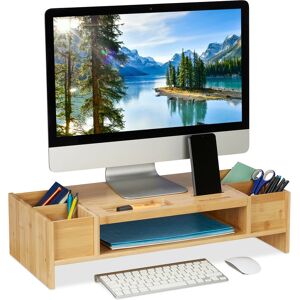 This monitor riser for desks ensures order at the workplace and a healthy, ergonomic sitting posture. The monitor elevator made of bamboo lifts the view and ensures an upright posture. In the small compartments of the monitor stand, you can store important office utensils within easy reach or place plants and decorations for a pleasant working atmosphere. After a successful day at work, you can simply slide the keyboard under the shelf to save space. Monitor Stand Details - Dimensions H x W x D: approx. 15.5 x 62.5 x 28 cm - Free space under stand H x W x D: approx. 5 x 60 x 28 cm - Max. Load capacity: 15 kg - Weight: approx. 4 kg - Material: bamboo - Colour: natural wood Desk Organiser with Plenty of Compartments - Footprint for monitor W x D: approx. 38 x 20 cm - Large compartment on board H x W x D: approx. 1 x 16.5 x 6 cm - Small compartments on board H x W x D: each approx. 1 x 9 x 1 cm - Shelf H x W x D: approx. 7 x 38 x 28 cm - Side compartments H x W x D: approx. 9 x 10 x 5.5