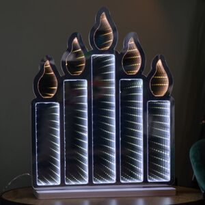 Transform your holiday decor with this stunning Christmas Tree infinity led light decoration. Infinity lights are a modern mirror effect using light to create an illusion of depth and a repeating light pattern. This simple yet mesmerising light up display is thin whilst creating this amazing 3D effect as you view the tree from different angles. Create a festive display and a talking point for all your family and guests. Suitable to be placed on most flat surfaces such as a mantle piece, windowsill or by the front door to welcome visitors this year. Featuring an infinity mirror with Green and Gold LEDs, this creates the never ending reflection of the tree when lit up. The decoration sits on a metal base and is mains powered with a generous 3 meter clear cable. Quick and easy to set up, just simply peel the film off the mirror then attach the base and plug in. Suitable for indoor use and sheltered outdoor use (transformer plug must remain indoors). Product Dimensions Height: 40cm Length 28cm Stand 13cm x 6cm Cable Length 3m