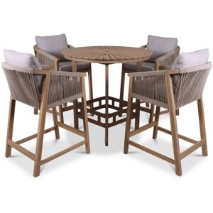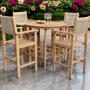 Roma Bar Set 100cm High Table with 4 rope Bar Armchairs Features: 4x Roma bar chairs. Includes a Sunray 100cm round bar table with a parasol hole. Made of Acacia hardwood with a PU coated light teak look finish. 6mm beige polyester round rope weave. Galvanised fittings for rust protection. New contemporary style. RoyalCraft exclusive design. Dimensions & Weight: Dimensions: Table: L100 x W100 x H96 cm Chair: L55 x W58 x H120 cm Weight: 62 kg . Roma Bar Set 100cm High Table with 4 rope Bar Armchairs . Delivery is Free to UK Mainland excluding the following postcodes where a surcharge may apply:- AB, DD8-11, KY10-15, TD15, BF0-BF99, please check before ordering.. 5#7