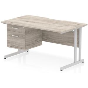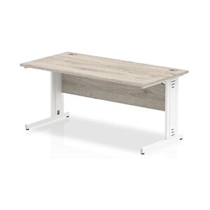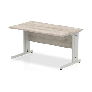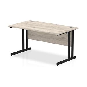 Impulse contract 1400 wide desk. 25mm tops. Wire management panel. Heat resistant grey oak melamine finish. 18mm modesty panel. 2mm protective abs edging. Black coated double strut legs. 2 cable ports. Height adjustable feet. Steel to steel fixings.