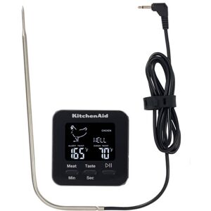 Monitor food temperatures inside the oven with the KitchenAid Digital Kitchen Thermometer with Timer and In-Oven Probe. Monitor cooking progress without having to open the door thus maintaining even air temperature for the better results. This KitchenAid thermometer features 8 preset protein settings - beef, pork, fish, veal, lamb, chicken, turkey, hamburger with multiple taste options. An alarm signals when food reaches a preset time or internal temperature for excellent results. This in-oven probe thermometer comes with a durable 15cm stainless steel probe with a 1.2m silicone cord and cord storage system. This digital kitchen thermometer from KitchenAid also doubles as a cooking timer and can be programmed to count up or down to 99 minutes and 59 seconds. The thermometer and time function independently of each other and cannot be used together. The bright backlit display is easy-to-read and displays a temperature range of -40 to +250°C (-40 to +482F). Clean by wiping with a damp cloth and then drying thoroughly. Requires 2x AAA batteries (not included). The KitchenAid Digital Kitchen Thermometer with Timer and In-Oven Probe is supplied with a 1 year manufacturer's warranty.