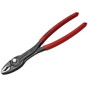 82 01 200 SB KNIPEX TwinGrip® Gripping, tightening and loosening screws with worn heads and threads. Unique combination: Front grip and side grip function, box joint, push button adjustment. High-grip front jaw with robust teeth and high gear ratio at the tip of the mouth. Very slim pliers let you work even in confined installation spaces with a narrow turning zone for fast results. Pinch stop reduces the risk of crushed fingers. Durable and resilient thanks to robust box joint. The all-rounder for all common tasks. Large front and side gripping capacity for diameters and widths across flats 4 - 22 mm. Reliable, frontal gripping of flat workpieces up to 8 mm thanks to three-point system. Five-way adjustable slip joint with push button adjustment for precise adjustment of gripping capacity. - Adjustment positions: 5- Capacities for pipes (diameter): Ø 5/32 – 7/8in- Capacities for pipes (diameter): Ø 4 – 22mm- Capacities for nuts: 4 – 22mm- Capacities for nuts: 5/32 – 7/8in