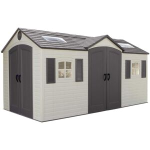" Lifetime 15 Ft. x 8 Ft. Outdoor Storage Shed Product Description Lifetime's 15-foot wide Sheds are not only built for superior strength and durability, they also have an attractive appearance and design to accent the beauty of your backyard. The convenient, centralized location of the doors allows for easy access to your storage without having to climb over things to reach items stored in the back. The innovative design and durable construction creates the perfect solution for your storage needs. 109 square ft. (750 cubic ft.) - The Lifetime 15 ft. x 8 ft. Shed (side entry) has two sets of double doors (front and side) and features: (6) small skylights, (2) large skylights, (2) shatter-proof polycarbonate windows, (2) screened vents, (2) decorative shutters, (2) peg strips, (1) 90 in. x 9 in. shelf, (4) corner shelves, (1) tool corral, and a 10-year limited warranty. Floor and installation hardware included. Comes in (3) boxes. Features & Benefits Adjustable Shelving and Storage