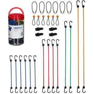 These elastic bands in different shapes and lengths are the perfect accessories for your next road trip or bicycle tour. Secure your luggage in your trunk, on the trailer or on a luggage rack and start your trip knowing everything is secure. The elastic tensioning straps are also a good choice for transportation routes where you have to bring something from A to B. If you hook the sturdy hooks of the expanders into each other, you can even extend the length to meet your needs. Cord Set of 30 in Detail - 2x yellow cords, each approx. 103 cm long - 2x green cords, each approx. 85 cm long - 4x red cords, each approx. 64 cm long - 6x blue cords, each approx. 49 cm long - Rope diameter: approx. 8 mm Additional Details - 6x mini expanders: each approx. 25.5 cm long - Rope diameter: approx. 4 mm - 6x ball tensioners: each. approx. 22.5 cm long - Rope diameter: approx. 3.5 mm - 4x clamps H x W x D: approx. 8.5 x 3 x 2.5 cm - Container H x D: approx. 29 x 12 cm/ approx. 1.4 kg - Material: