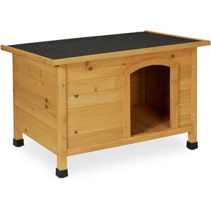 With this dog house, you can offer your four-legged friend a cosy home in your garden. The dog house is made of sturdy, weatherproof wood and is equipped with a waterproof roof made of bitumen, so that it offers a place to hide even in the rain. The high feet raise the kennel off the ground and ensure that the floor does not get damp and soggy. Thanks to the hinged flat roof, cleaning the pet house is a breeze. Dog House Details - Dimensions H x W x D: approx. 58 x 86 x 58 cm - Interior dimensions H x W x D: approx. 43 x 70 x 45 cm - Dimensions entrance H x W: approx. 34.5 x 24 cm - Distance from floor: approx. 10.5 cm - Weight: approx. 11.27 kg - Material: fir wood, roofing felt, plastic - Colour: natural wood, black Cute Kennel for Cats and Dogs - Ideal retreat for four-legged friends outdoors - Pet house made of robust wood with weatherproof bitumen roof - Sloping roof prevents waterlogging: rainwater can run off - High feet for protection against damp and cold - Hinged flat roof