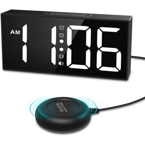 [Wake Up Easily with Strong Vibration]: In contrast to traditional alarm clocks, our super loud alarm clock comes with a vibrator. For those who don't want to be woken up by or don't want to disturb others can choose to use the vibration mode alone as a bed calling service. [Multiple Wake-up Modes]: In addition to wake up with vibration alone, you can also choose to wake up with ringing alone, or ringing plus vibration together. Our super loud ringing sound is enough to wake up deep sleepers or people with poor hearing or the elderly. [Adjustable Volume & Brightness]: This vibrating alarm clock supports 4 levels of volume adjustment (0-110 dB range) and 5 levels of brightness adjustment. No need to worry about the screen being too bright to fall asleep or too dark to see the time, while the adjustable volume provides a variety options for the elderly, teenagers, or those with limited hearing. [Easy Snooze & Dual Alarms]: When the alarm goes off, the button on the vibrator or touch the