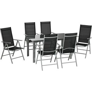 Enjoy your socialising time outdoors comfortably - look to this garden table and chairs set from Outsunny. Comes with six padded armchairs and a tempered glass-top table. Steel frames make each piece strong. High backs and armrests on the chairs for support, with a padded seat for comfort. The table is fitted with a tempered glass tabletop - comes with a middle hole to hold a parasol umbrella in place (Φ38mm sized pole).Features:Seven-piece set: six chairs and dining tableSteel frames are strong and supportiveMiddle dining table - glass top, with Φ38mm middle hole for parasol umbrellaPadded cushion chairs for comfort. High backs and armrests support youFor all garden and outdoor spacesAssembly required