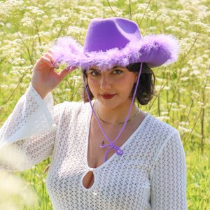 PURPLE LILAC COWGIRL HAT WITH MARABOU TRIM: Get yourself dressed up and ready for a night full of music, fun and great memories with our Purple Lilac Cowgirl Hat with Marabou Trim, become a true country gal or guy singing and dancing the night away! COWGIRL HAT DETAILS: This Cowgirl Hat is a pretty Purple Lilac colour, with a fluffy, Purple Marabou Feather detail around the brim and an adjustable Purple string for extra comfort, the perfect way to finish off your outfit! AVAILABLE IN MULTI PACKS: The Purple Lilac Cowgirl Hat with Marabou Trim is available in multiple sized packs, from Single Packs to Packs of 3, Packs of 6, Packs of 12, Packs of 24, and Packs of 48 for you to share with family and friends! ONE SIZE FITS MOST: The Purple Lilac Cowgirl Hat is the perfect size for most to wear with a suitable head size of 58cm (23"), and an adjustable string to wear comfortably all night long! PERFECT FOR MUSIC EVENTS: There's no better way to celebrate a night filled with music and dancing than with our Purple Lilac Cowgirl Hat with Marabou Trim!