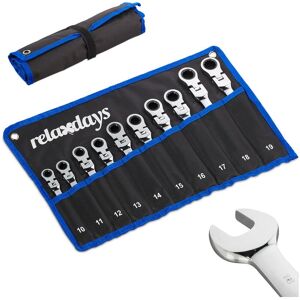 With this ring ratchet spanner set you have the right spanner quickly at hand. The 10-piece set contains the spanner sizes 10 to 19 mm each as open-end and ring spanners. The ratchet and the joint of the ring spanner ensure comfortable handling. The set is neatly stored in the tool bag. When travelling, the bag can be rolled up and transported in a space-saving way. At home, it can be hung on the wall via the 2 holes. Ring Spanner Set in Detail - Dimensions of bag when rolled out H x W x D: approx. 29 x 43 x 1 cm - Dimensions of bag when rolled up L x D: approx. 29 x 7 cm - Total weight: approx. 2.04 kg - Width across flats: 10 to 19 mm - Material spanner: Chrome vanadium steel - Material bag: Fabric - Colours: Silver, black 10-piece Combination Spanner Set - 2 in 1: One side with combination spanner and one with open-ended spanner - Combination spanner with ratchet function for easy handling - Flexible head tilts up to 180° thanks to joint - Neat and handy storage in practical bag