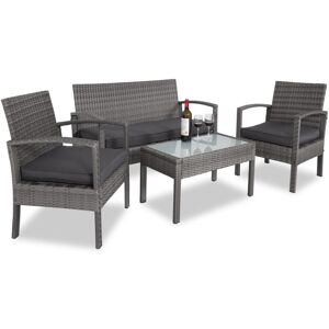 Take a seat, feel good, soak up the sun! The CASARIA® seating group for 4 people with a table, a bench and two comfortable garden chairs invites you to enjoy cosy summer evenings in the garden , on the patio or on the balcony. The hand-woven polyrattan is weatherproof, UV-resistant and dirt-repellent. Soft, 5 cm thick cushions make sitting a pleasure, and all covers can be washed at 30°C. The table top made of 5 mm thick, frosted safety glass gives the seating group an elegant look. A galvanised, powder-coated steel frame ensures stability. The table can be loaded up to 80 kg, the seats up to 160 kg each. Product features: Modern design Ideal for indoor and outdoor use Suitable for 4 people Hand-woven polyrattan Weatherproof, UV-resistant, dirt-repellent 5 mm safety milk glass top 5 cm thick, water-repellent cushions Washable covers with zip Height-adjustable feet on chairs & bench Technical specifications: Table dimensions: 76x40x41 cm Chair dimensions: 57x77x55 cm Bench dimensions: