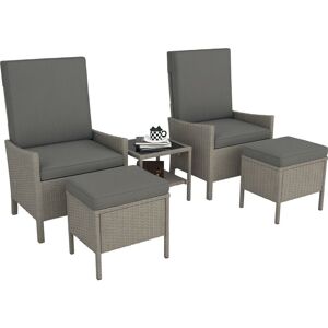 Rest and relax with company, with this Outsunny conservatory furniture. Five pieces - two reclining chairs, two footstools and a matching coffee table so you can relax with company. The two chairs have 130° reclining backs, with padded cushions for comfort. Each piece has a powder coated steel frame for a strong core, wrapped in plastic wicker for extra durability and style. Complete with adjustable feet for balance. Specifications: ● Colour: Grey ● Material: PE Rattan, Steel, Yarn-dyed Fabric (100% Polyester) ● Chair Dimension: 73W x 80D x 105H cm ● Footstool Dimension: 73W x 46D x 40H cm ● Table Dimension: 45W x 45D x 40H cm ● Seat Size: 56W x 60D cm ● Seat Height (without cushion): 36 cm ● Back Size: 53W x 80L cm ● Cushion Thickness: 6 cm ● Weight Capacity: 120 kg (chair/footstool), 30 kg (table) ● Item Label: 860-336V71GY Just so you know: this item ships and arrives in separate boxes. Delivery times may vary with each box. Box quantity: 3 Features: ● Comes with two reclining