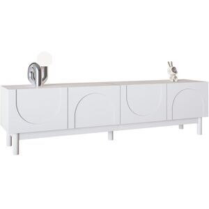This TV stand, measuring 169X34X45.5 cm, stands out with its elegant pure white finish. white solid wood legs complement the minimalist design and provide extra stability. The cabinet features four uniquely designed doors that open without handles, giving it a modern and elegant appearance. Two of the doors are equipped with shelves for storing your personal belongings. Made from high-quality wood and fitted with premium hardware, this TV cabinet ensures durability and stability. This practical and beautiful TV cabinet offers generous storage space for your multimedia devices and other items, keeping your living space neat at all times. It is a must-have for modern living rooms, embodying both elegance and order. Product Features: Elegant and practical TV cabinet: This TV cabinet, measuring 169*34*45.5 cm, impresses with its simple and elegant pure white design. The legs made of solid white wood complement the minimalist look and ensure stability. Timeless design: The TV cabinet with