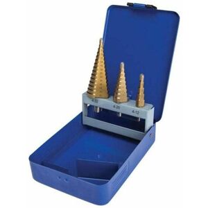 The BlueSpot Step Drill is manufactured from high steel for increased durability and cutting power. Titanium coated to reduce friction and heat. Specially designed for precision drilling of holes in aluminium, brass, copper, plastic, steel and wood. 2mm step increments. The set is supplied in a robust metal case and contains the following: 1 x 5 Step Drill 4-12mm 1 x 9 Step Drill 4-22mm 1 x 10 Step Drill 4-32mm
