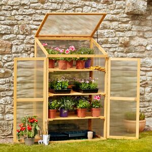 Cold frames protect plants from cold and wet conditions, designed with 3 shelves to give you plenty of room for all your plants and flowers. Easy to open: the hinged lids and double doors make accessing your plants hassle-free and durable. Constructed from a strong and durable fir wood frame with polycarbonate panels. The growing season and keep your delicate plants protected from harsh weather conditions with this three-tier wooden cold frame. Cold frames are great for protecting young seedlings, vegetables, or flowerbeds from adverse weather, primarily cold and wet. Lift and transplant fragile plants into the cold frame for protection from frost through the winter months. The transparent roof and windows allow sunlight to penetrate without the risk of heat escaping. This cold frame is constructed using strong and durable fir wood with polycarbonate panels. Featuring a hinged lid and double doors to make accessing your plants hassle-free so you can tend to them easily, it will make a great addition to any garden. The cold frame has three separate shelves, providing plenty of room for all your plants. The shelves are also slatted to help circulate air around your plants whilst also helping to encourage water to drain away easily, thanks to their flat, barred design. Dakota Fields