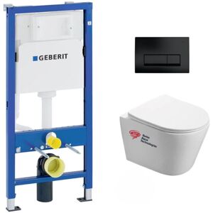 Features of the Toilet set UP100 frame + Delta01 plate + Grohe Bau Ceramic rimless bowl + softclose seat (BauGeb1) : Geberit Duofix basic UP100, 112 cm, with concealed water tank UP100 (458.103.00.1) Grohe Wall hung WC set (39351000) Geberit Delta01 white flush plate (115.135.11.1) Geberit Duofix basic UP100, 112 cm, with concealed water tank UP100 (458.103.00.1) : 112 cm galvanised support frame with adjustable feet from 0-20 cm UP100 water tank (with 25-year manufacturer's warranty on spare parts) pre-painted frame in Geberit blue support feet with cm scale marking swivel feet for mounting in UW50/UW75 profile crossbar for cladding support 2 threaded rods M12 for fixing the ceramic tiles with an intermediate distance of 18 or 23 cm concealed cistern 4-6-7.5 l, insulated against condensation two-stage front operation with Delta21, Delta20 or Delta50 plates supply from the back/top angle stop valve R1/2', housing for inspection hatch construction protection made of styrophor drain