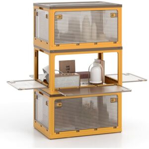 Effortlessly organize your space with our stackable storage bins. With a large storage capacity, these bins are perfect for storing clothes, toys, books, snacks, and more. The 5 opening ways design also allow you conveniently fetch your belongings from multiple directions. Each storage box is equipped with wheels on the bottom, allowing for easy mobility and standalone use. It also features a collapsible design that not only saves space but also makes installation a breeze. Moreover, the embedded receptacles for desiccant or insect repellent provide added protection for your belongings. Upgrade your storage solutions with these versatile and practical storage containers! Costway 292L Collapsible Storage Bins 3 Pack Stackable Storage Boxes with Lids in Yellow