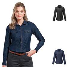 Womens shirt. Long sleeve denim shirt with contrast stitch detail with two chest pockets. Buttoned cuff and sleeve guard. Curved hem. Back yoke. 127gsm. Fabric: 100% Cotton Ringspun Denim. Washing Instructions: Domestic wash at 40 degrees. Womens Chest Sizing: XS - 8, S - 10, M - 12, L - 14, XL - 16, 2XL - 18, 3XL - 20.