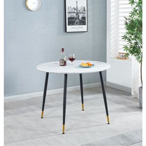 This attractive dining table is a versatile piece that will take pride in place in any kitchen or dining room. This round dining table offers plenty of space, but it is still compact enough to fit comfortably in a room of any size. The table-top looks smart and stylish with its veneer and black finish. Matching black legs are the perfect complement and look stunning with golden decoration. All in all, you have plenty of options to choose from with the dining table, and whatever combination you choose, you can be sure that you will add a touch of quality to your home. Features Metal Legs with Golden Bottoms Trendy Design Sturdy Assembly: Legs need fixing Finish: MDF Top with Power Coated Metal Legs Colour: White Height: 75cm Width: 100cm Length: 100cm