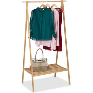 This coat rack convinces as a clothes rack in the hallway, office or bathroom, where it also sets decorative accents with its natural bamboo look. Jackets, shirts, dresses or even blouses can be hung neatly on the clothes rail of the stand. The lower shelf creates additional storage space for matching shoes as well as bags or other accessories. When not in use, you can simply fold up the coat rack and store it in a space-saving way. Coat rack in detail - Overall dimensions H x W x D: approx. 170 x 100 x 56.5 cm - Folded dimensions H x W x D: approx. 172.5 x 100 x 8 cm - Load capacity: approx. 15 kg (clothes rail), 15 kg (shelf) - Weight: approx. 4.2 kg - Material: Bamboo - Colour: Natural Clothes rail with shoe rack - Clothes rail W x D: approx. 76.5 x 2.5 cm - Hanging space H: approx. 136 cm - Shelf W x D: approx. 77 x 46 cm Foldable coat rack made of bamboo - Hang jackets, blouses etc. neatly on hangers - Place shoes, bags or accessories on the shelf - Coat rack made of natural