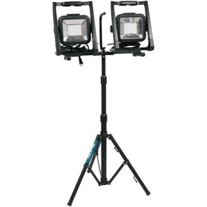 Corded and cordless LED worklight compatible with both 14.4V and 18V Makita Li-ion batteries. The new Makita DML805 LED work-light will run on 240v mains power or 14.4v and18v Lithium-ion batteries from the Makita range. The twenty 0.5watt LED s provide a bright and even light and there is a full beam and low level setting on the simple push button control. The light unit is mounted in a rugged moulded carry cradle with flat base and top handle that can serve as a hanging bar. A simple rotating knob releases the angle setting which can spin through 360 . Ideal for site operations this work-light features Makita Extreme Protection Technology, XPT, against water and dust ingress. It has three tripod mounting options as standard. Using a 4.0Ah 18v Makita Li-ion battery the DML805 LED work-light has a continuous run time in high setting of a useful 6.5 hours. This set also includes a telescoptic tripod DML805 Features and Benefits: 2-mode operation: delivers 750 lumens on High mode or 450