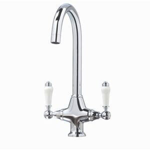 Features and Benefits: Finished in chrome This sink mixer features Swivel Spout The chrome taps are supplied with white and black indices Crafted from quality hard wearing solid brass material WRAS approved product Suitable for deck mounted installation Easy to install save time and money Stylish,traditional look in your bathroom at exceptional value Guarantee: Lifetime (12 months on serviceable moving parts from the date of purchase. Does not cover any product that has been modified, altered, transformed, or relocated in any way) Supplied without waste Fixture Kitchen Sink Tap Type Sink Mixer Mounting Deck Minimum Pressure 0.2 Bar Maximum Pressure 5.0 Bar Tap Handle(s) 2 Tap Hole(s) 1 Tap Head Shape Lever Tap Operation Standard Valve/Cartridge Type Manual Swivel Spout Yes Tap Height 345.6mm Tap Spout Reach 171.6mm Tap Base to Spout 244mm Inlet Connection Size 1/2 BSP Tap Body Shape Round Material Brass Colour Chrome Brand Orbit Collection Harrogate Style Traditional Market Domestic