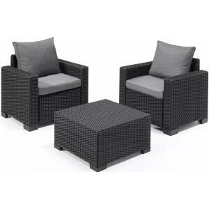 Keter California 2 Seater Garden Bistro Set - Grey The California balcony set is made of more than 83% recycled resin with a 6mm round wicker design. The woven wicker style creates a luxurious and trendy look and can create a focal point in any outdoor space. The set consists of two wide lounge chairs, and square coffee table which is perfect two for hosting in indoor conservatorys, or outdoors in gardens and patio areas. The cushions included are 7.5cm thick and provide optimal seating comfort to relax and unwind. Lightweight in its structure therefore is easier to move to suit any setting and is easy and quick to assemble. The garden set is completely maintenance-free and weather-resistant, so you can enjoy the lounge set for years to come. Product Features: Ideal indoor/outdoor lounge set for gardens, conservatories and entertaining spaces Built for comfort with a cushion thickness of up to 7.5cm the California balcony set includes a 2 armchairs and a coffee table to accommodate up