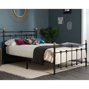 The Atlas is a very traditional style bed that has a beautiful and elegant design which will match many different styles of bedroom decoration. The bed frame is constructed using metal and is strong and durable with a glossy black finish.. . The headboard and foot end are matching in design with four contrasting antique brass finials adorning the four corners. The shell like detailing adds to the luxurious feel of this bed. . . The inclusion of the sprung slatted base will give a more natural feel to your mattress and increase the support offered.. . The Atlas bed is delivered flat packed for ease of delivery and storage, The bed is designed with easy self assembly in mind.