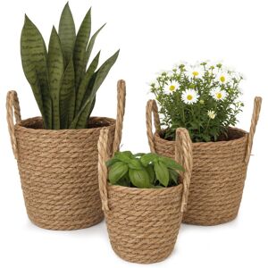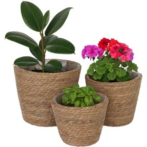 This set of three round plant pots skilfully showcases your green treasures. Whether for cyclamen, palm trees, or monsteras, these flower baskets in three sizes are perfect for various indoor plants. The pots are lined with a plastic coating, making them suitable for direct planting. Visually, these planters impress with their natural reed design, which beautifully complements both boho and country-style interiors. Flower pot set of 3 in detail - Large pot H x D: approx. 23 x 25.5 cm - Medium pot H x D: approx. 19.5 x 21.5 cm - Small pot H x D: approx. 16 x 19.5 cm - Material: reed, plastic - Available in various colours Round reed planters - Set of 3 planters in different sizes - Lined with plastic for direct planting - Natural appearance complements flowering and green plants perfectly - Ideal for country house or boho-style interiors - Suitable for flame cactus, hydrangea, ivy, and more Included in delivery - 3x plant basket - Decorative items are not included in the delivery