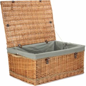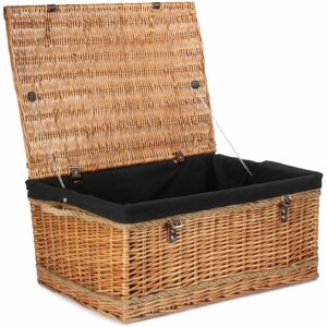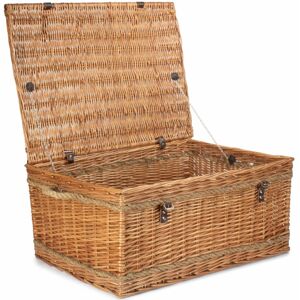 Full double steamed willow with real leather straps and rope handles . Attractive looking . High Quality, Well made Basketware. Natural product so dimensions can vary slightly. Size Depth 500 x Height 340 x Width 720 Weight 4.2kg Material Wicker Red Hamper 72cm Double Steamed Rope Handled Wicker Trunk in Brown