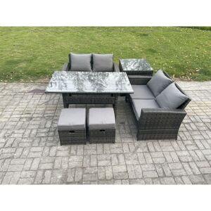 This outdoor garden furniture sofa set has plenty of space for 6 people to sit, with tempered glass coffee table to hold food, drinks and more, a perfect addition to your patio, garden, backyard, pool and other indoor and outdoor spaces. Set Dimensions: • 2 x Side coffee table :65L x 65W x 66H cm • 2 x Big footstool :65L x 65W x 34H cm • 2 x Reclining Chairs: 74L x 67W x 79H cm • 1 x Love Sofa Size: 124W x 67D x 79H cm • 1 x Oblong Coffee table: 105L x 50W x 48H cm • Dark grey mixed rattan with dark grey fabric .Color may some difference due to light or monitor .we are unable to return the item due to color problem . The 2 armchairs are adjustable, you can adjust the inclination of the chair back from 90°-130° through the button . Items Comes Flat Packed And Easy Assemble,Sturdy Galvanized Steel Tube Metal Frames With Powder Coating To Prevent The Rust Flat PE Rattan Completely Made By Hand, 5mm Thickness transparent Tempered Glass With Sucker On Surface To Prevent Sliding Low