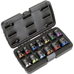 Manufactured from hardened and tempered Chrome Vanadium steel, with a phosphate finish for added corrosion resistance. Lock-On™ features specially machined flutes in the walls of the socket which enable use on up to 85% rounded fasteners. Colour-coded rings for fast identification. Supplied in storage case. SEALEY PREMIER - One of a comprehensive range of Premier Hand Tools, suitable for daily professional use. LOCK-ON™ - Features specially machined flutes in the walls of the socket which enable use on up to 85% rounded fasteners. COLOUR-CODED RINGS - Enable fast identification. DURABLE - Manufactured from hardened and tempered Chrome Vanadium steel with a phosphate finish for added corrosion resistance. CONVENIENT STORAGE - Supplied in storage case. LIFETIME GUARANTEE*.