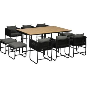 This eleven-piece set from Outsunny creates an inviting setting, ideal for garden and other outdoor areas. Using rust-resistant metal for a solid frame, round PE wicker is woven around for extra durability and weather resistance. The wood grain plastic table top is super easy to clean and adds a sophisticated look. The ottomans and chairs nest neatly under the table for compact storage when not in use as a great space-saving solution. Family get-togethers never looked so stylish.Features:Tough powder coated metal frame, with round PE wicker around for double the durability and strength outdoorsSoft padded back and seat cushions for comfort. Covers can be removed and washedAll chairs and footstools can easily tuck under table to save space when not in useLarge wood grain plastic top table for plenty of dining space for everyoneAssembly require