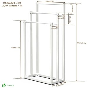 ADVANTAGES Sturdy and stable structure Space-saving design 3-tier construction Easy installation with no drilling required DESCRIPTION SOLID AND STABLE STRUCTURE: Made of sturdy metal with a rust-proof coating, this towel rack offers good durability. Its base is equipped with 4 non-slip pads that ensure perfect stability, even on smooth surfaces like tiles, while protecting your floor from scratches. SPACE SAVING: Whether your bathroom is spacious or more compact, this towel rack optimizes available space. Its vertical design minimizes floor space and fits easily next to the shower, bathtub, or sink, providing a more functional layout and a cleaner, more organized space. 3-TIER DESIGN: With its 3 different heights, this towel rack promotes good air circulation, speeding up drying time. It allows you to easily hang towels, bathrobes, bath mats, and other everyday items. Lightweight and freestanding, it moves effortlessly and fits perfectly in a bathroom, bedroom, or laundry room. EASY